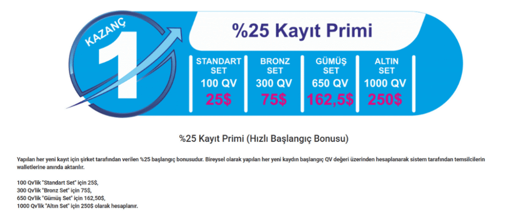 Yeni kayıt yaptığınız her üye için başlangıç setine göre anında 25$ – 250$ arası kazanç elde edersiniz.